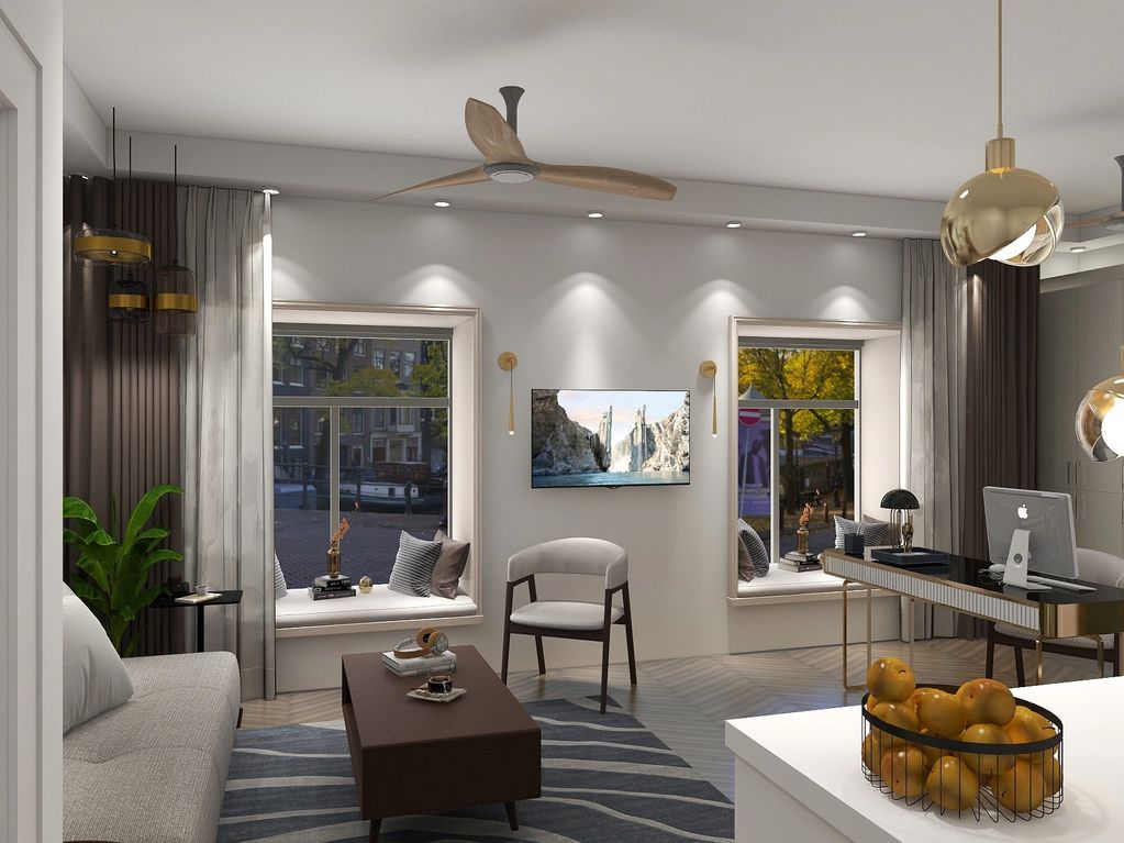 Proposed studio apartment, <500 sq.ft. in Montreal, QC Canada. This is a small studio with a u-shaped kitchen that we opened up to create a more inviting and versatile space. The small footprint of the kitchen is tailored for tiny living with big style points. The large platform windows of this stunning heritage building were previously under-utilized, so we transformed th